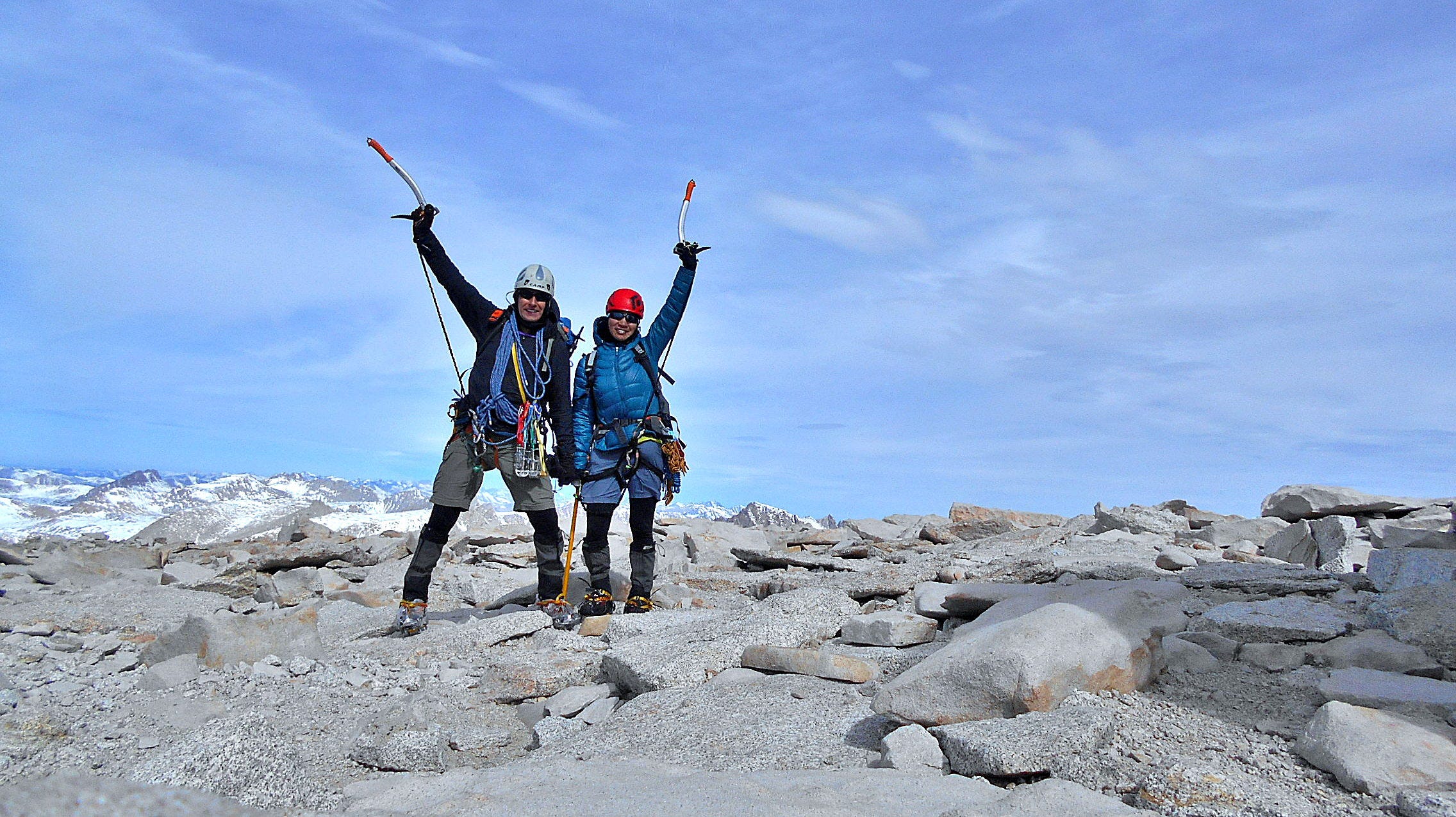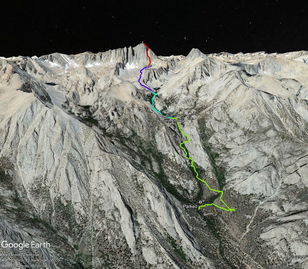 Two of us climbed Mt. Whitney via Mountaineer's route on Mar-15 2015. Because we arrived from sea level (Vancouver, BC) to make sure the climb will be smooth without altitude sickness stayed first night at Lower Boyscout Lake(3,150 m) and second at Iceberg Lake (3,850 m). Climbing day conditions were perfect, freezing overnight and zero wind at the top. The usually crowded summit was empty so we enjoyed it all to ourselves. We returned same way. Perfect trip.